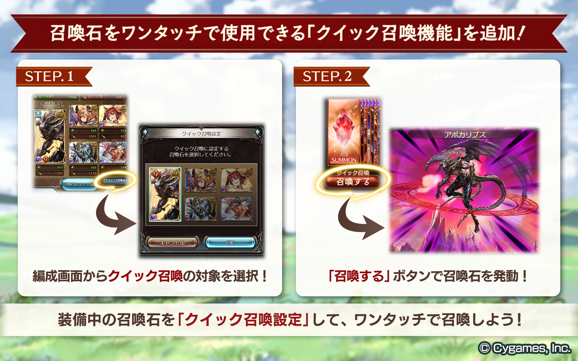 グランブルーファンタジー グランブルーファンタジー 本日のアップデートにて 召喚石をワンタッチで使用できる クイック召喚機能 を追加 装備中の召喚石のうち1つを クイック召喚石 に設定して バトル中にワンタッチで召喚する事ができます